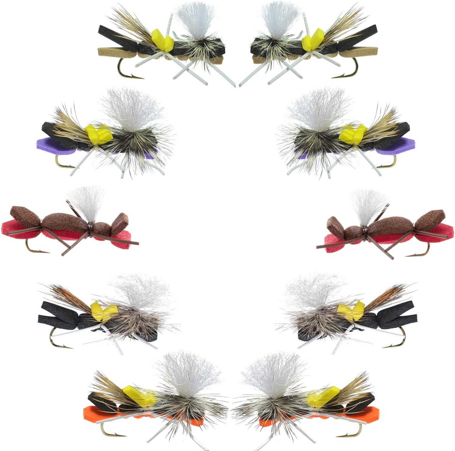 The Fly Fishing Place Basics Collection - Parachute Chernobyl Ant Foam Dry Fly Assortment - 10 Dry Fishing Grasshopper Dropper Flies - 5 Patterns - Hook Size 10